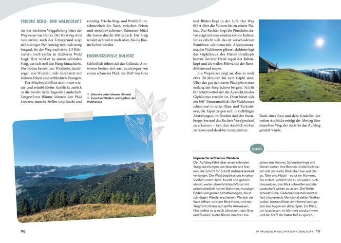 Lass die Seele baumeln auf 26 einzigartigen Wanderungen zum Erholen und Entschleunigen! Genieße eindrucksvolles Gipfelpanorama, romantische Wälder und sanfte Bergbäche auf stillen Pfaden in den Bayerischen Voralpen – fernab von Trubel, Stress und Hektik, mit jeder Menge Raum für Entspannung, Gelassenheit und Pausen. Mit praktischen Tipps zu Meditationen und Achtsamkeitsübungen.