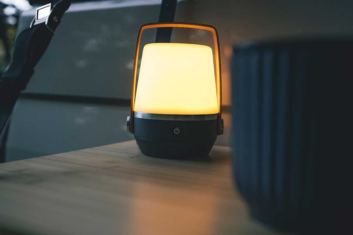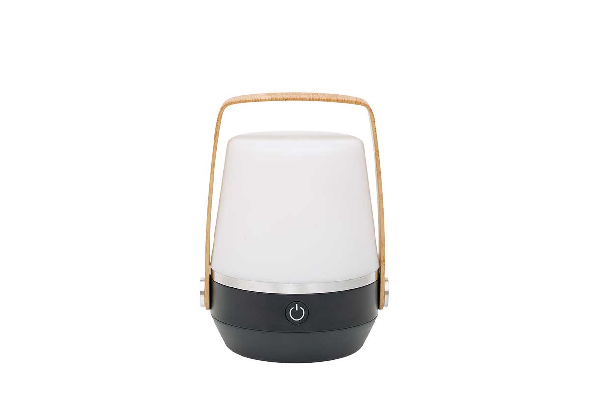 - Eine stilvolle, tragbare Lampe mit warmweißem Licht, perfekt für Innen- und Außenbereiche.