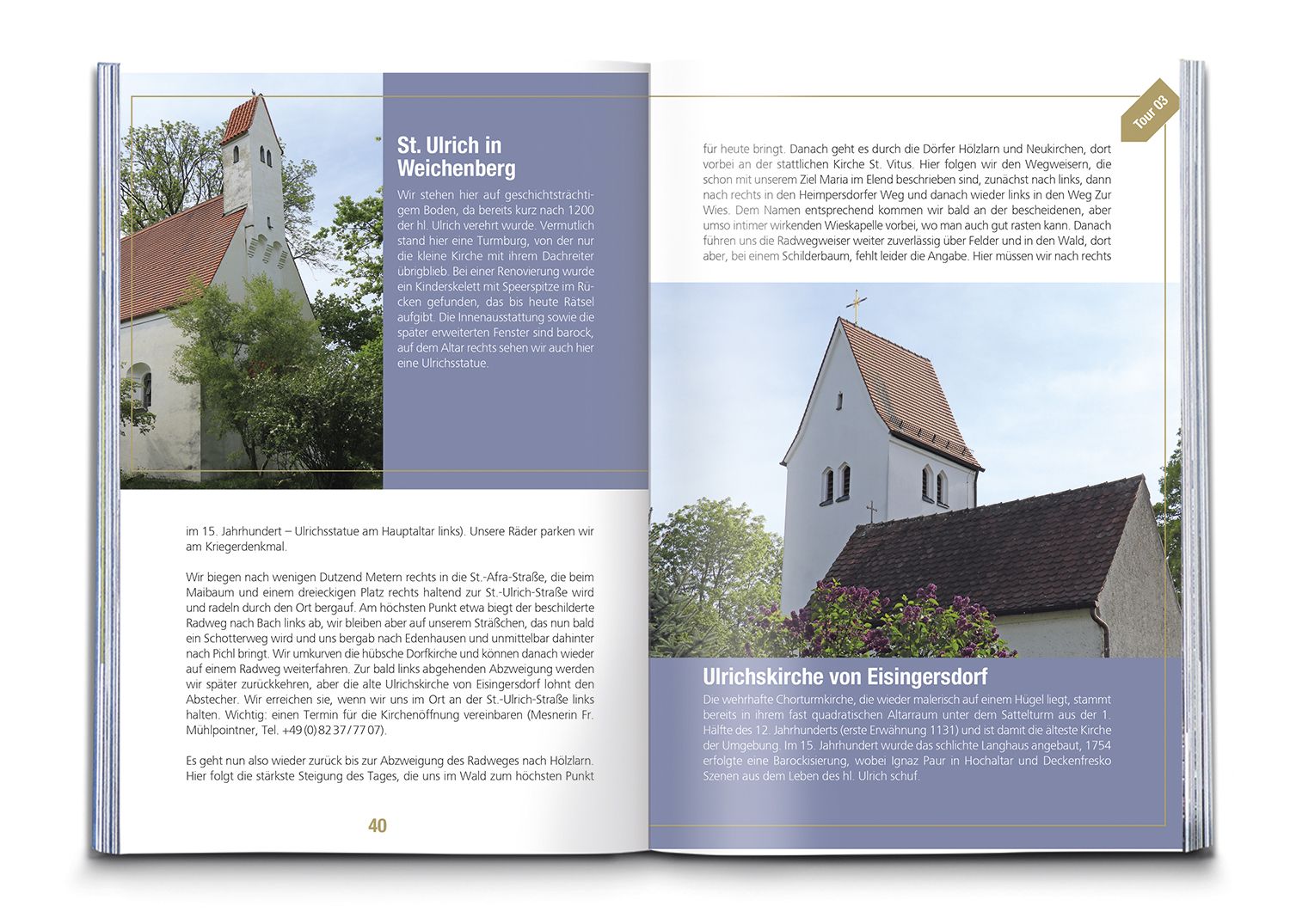 LUST AUF ABSCHALTEN? Wie wär´s mit Radpilgern? Auf den Spuren des heiligen Ulrich, Patron des Bistums Augsburg, führen 24 Fahrradtouren bis ins Allgäu. Das Autorenpaar Elsner, das für Pilgerführer bekannt ist, zeigt Touren, die alle an Kirchen und Kapellen vorbeiführen. Vorgestellt werden die Routen auch auf eigenen Kartendarstellungen. Die angesteuerten Kirchen werden mit reichlich Bildern und interessanten Texten erklärt.